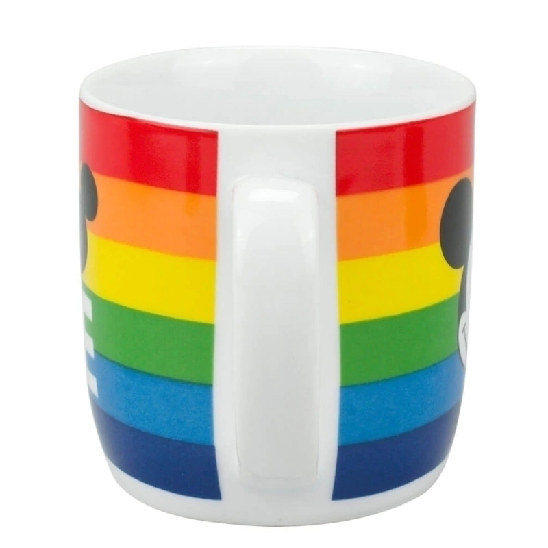 Caneca de porcelana com capacidade para 300 ml estampada com as cores do arco-íris e rosto do Mickey e ainda escrito Love.